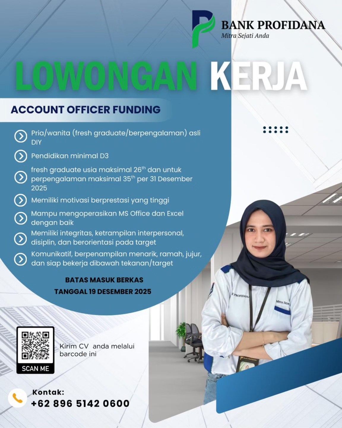 Bank Profidana membuka lowongan untuk posisi Account Officer Funding di wilayah DIY!