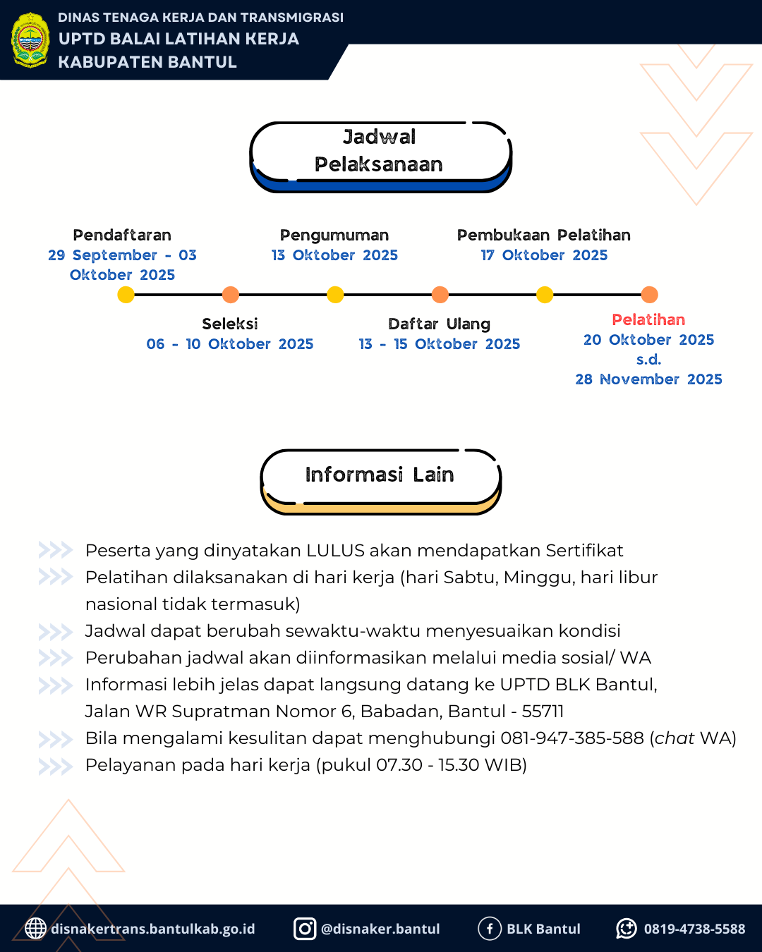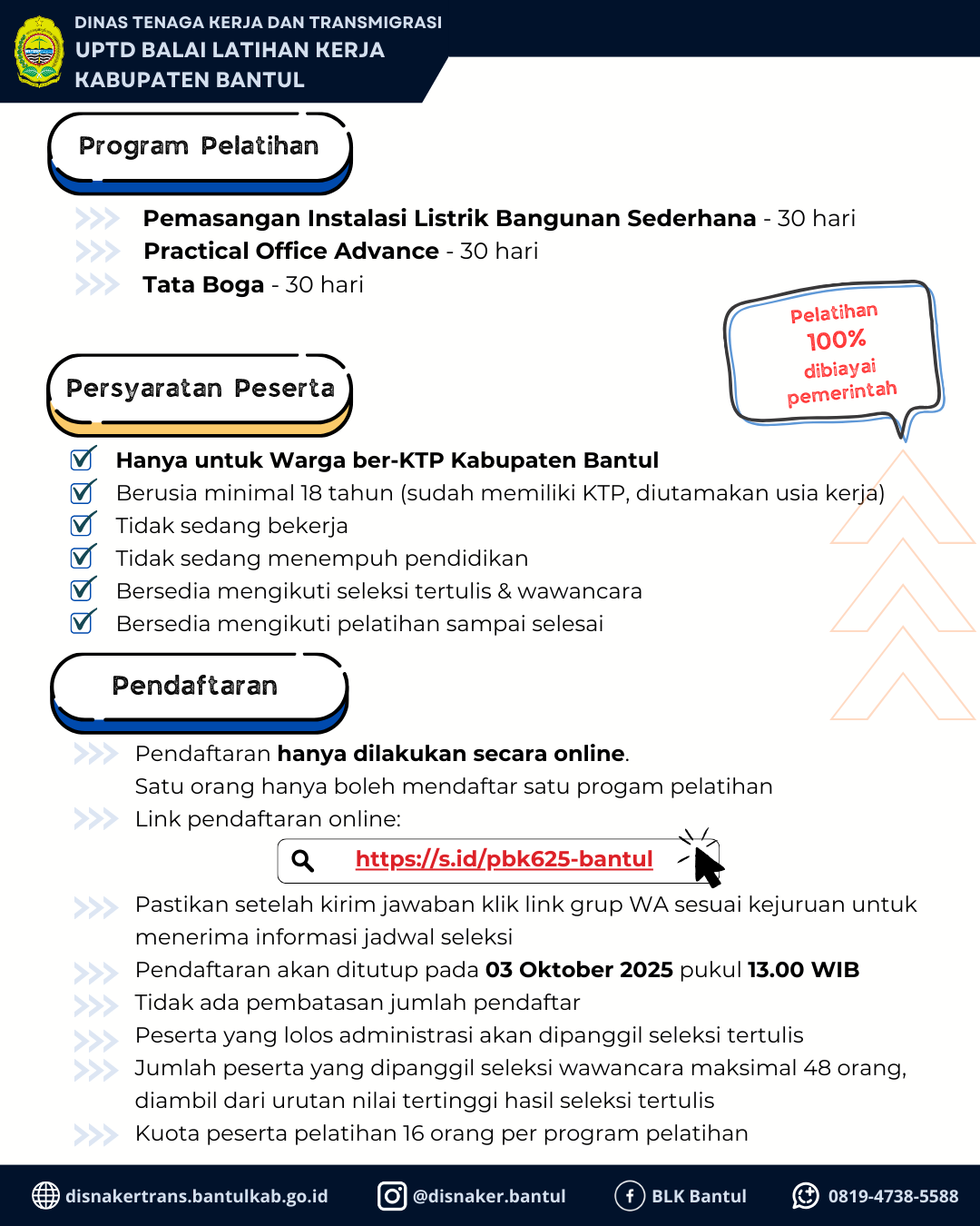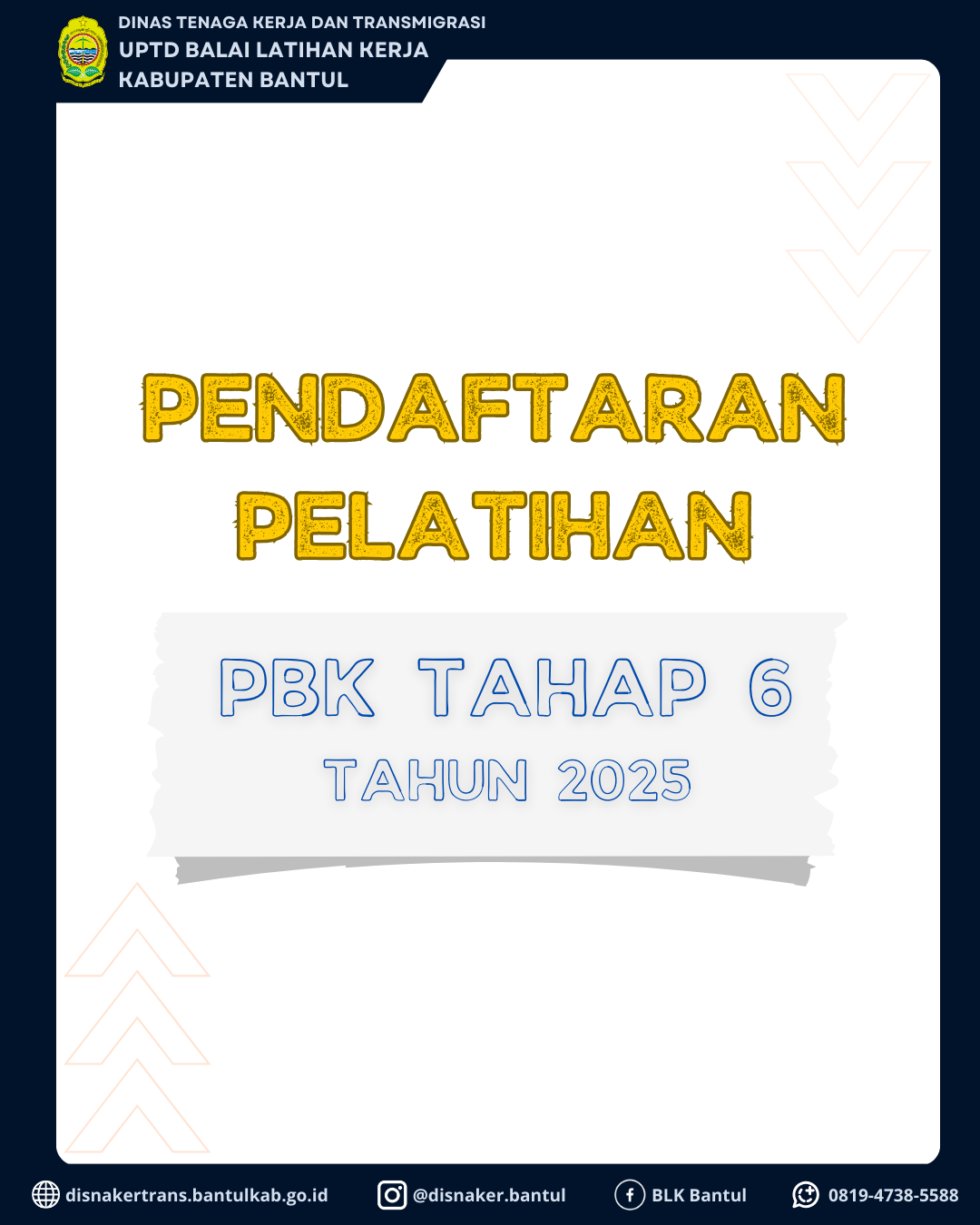 Ingin menguasai keterampilan yang dibutuhkan di dunia kerja? Yuk, daftarkan dirimu di pelatihan yang diselenggarakan oleh UPTD BLK Disnakertrans Kabupaten Bantul. Paket pelatihan terakhir di tahun 2025, ini! Jadi, jangan sampai ketinggalan.