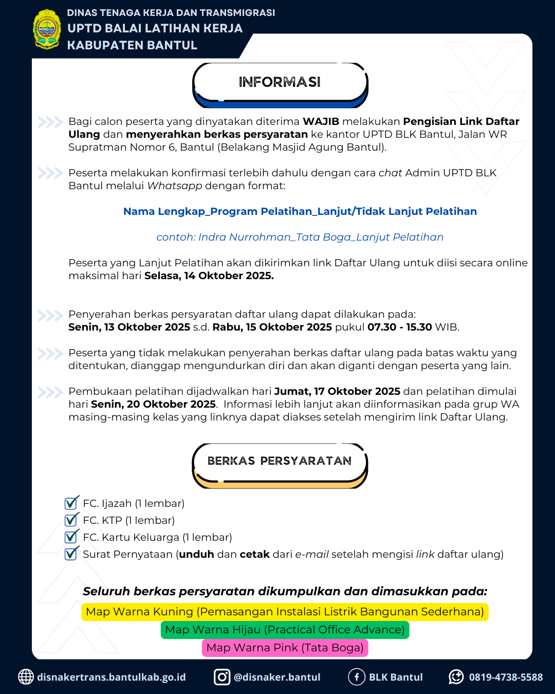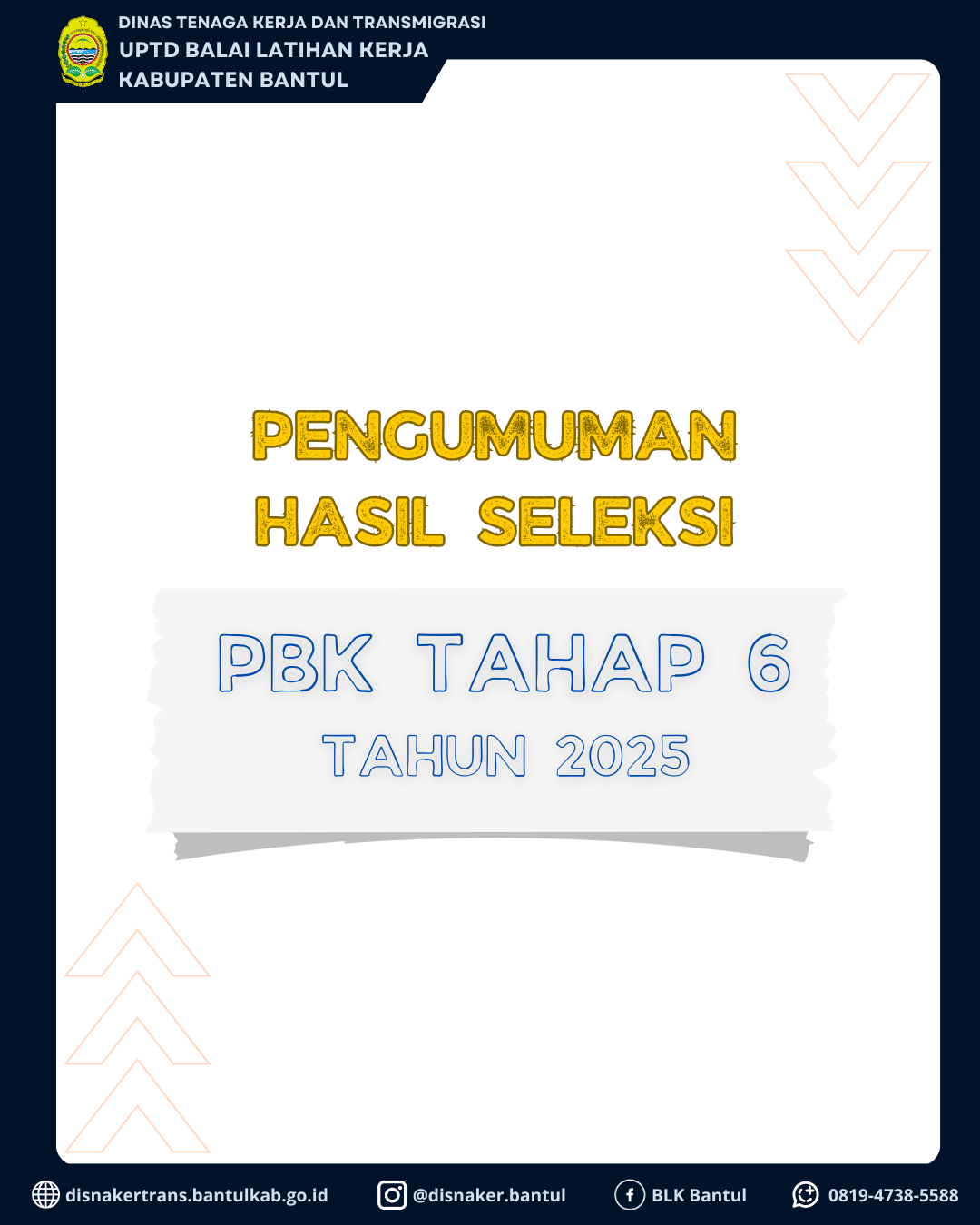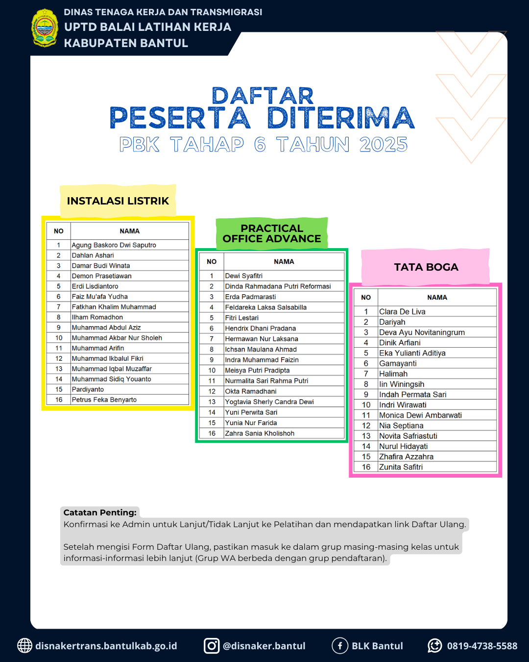 Pengumuman Peserta Diterima PBK Tahap 6 Tahun 2025 UPTD BLK Bantul.