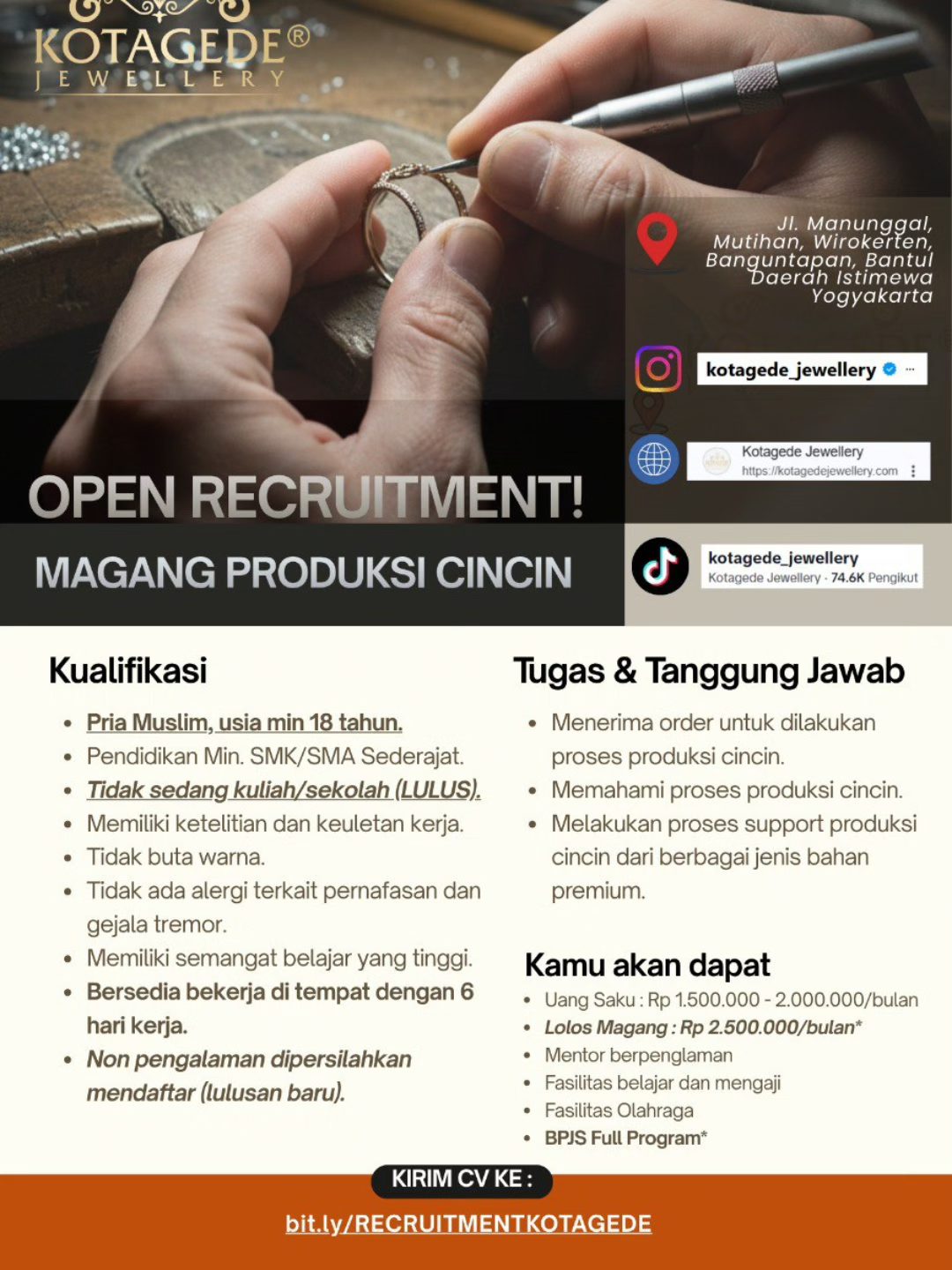 Open Recruitment! Magang Produksi Cincin Kotagede JewelleryKotagede Jewellery lagi membuka kesempatan untuk Magang Produksi Cincin nih! Kualifikasi :1. Pria Muslim, usia min. 18 tahun2. Pendidikan...