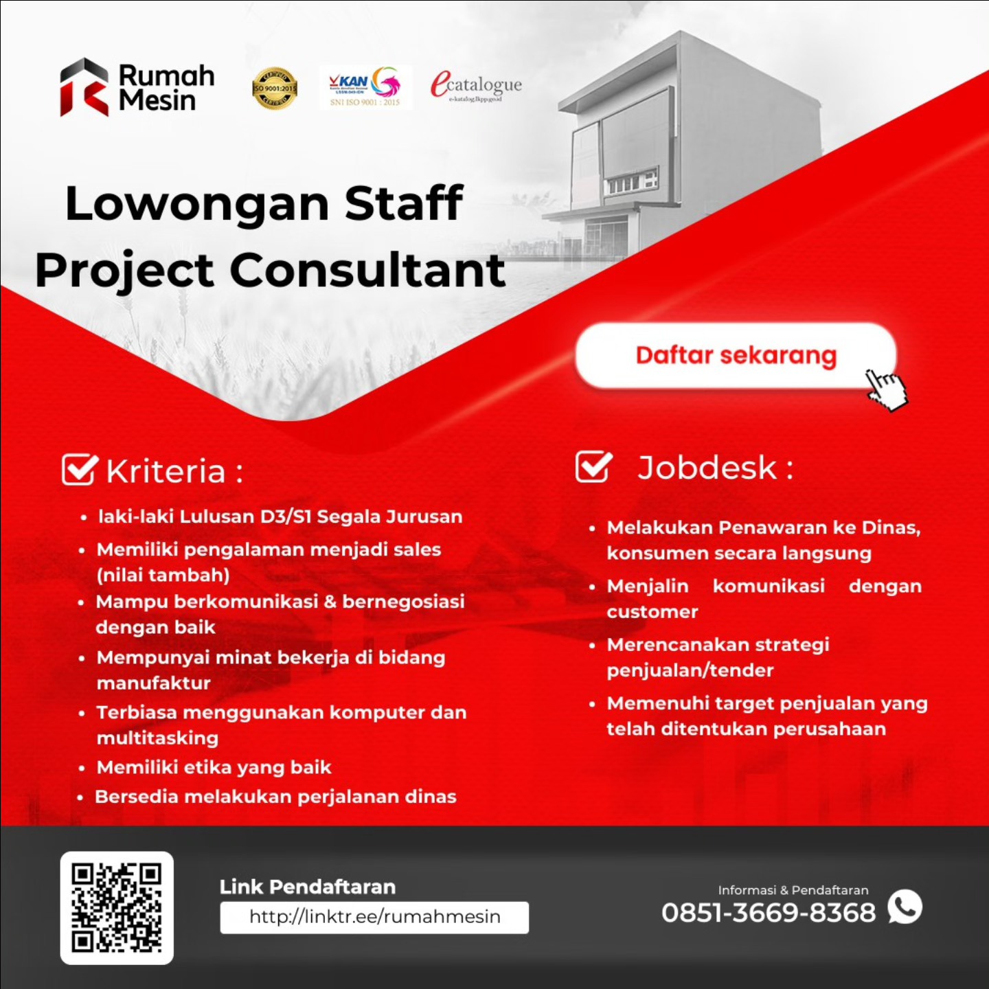LOWONGAN STAFF PROJECT CONSULTANT Yuk! Bergabung dengan Rumah Mesin untuk menjadi bagian dari tim kami! Sebagai posisi Staff Project Consultant Kualifikasi :1. Laki-laki, lulusan D3/S1 segala...