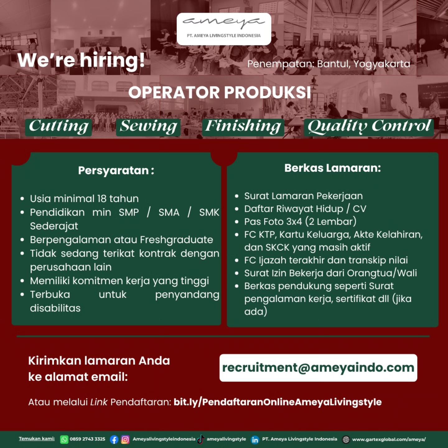 PT. Ameya Livingstyle Indonesia (industri garmen) sedang mencari Staff terbaik untuk jadi bagian dari tim solid kami, nih!